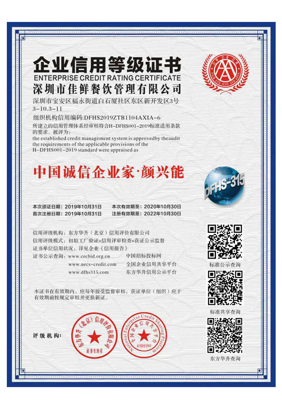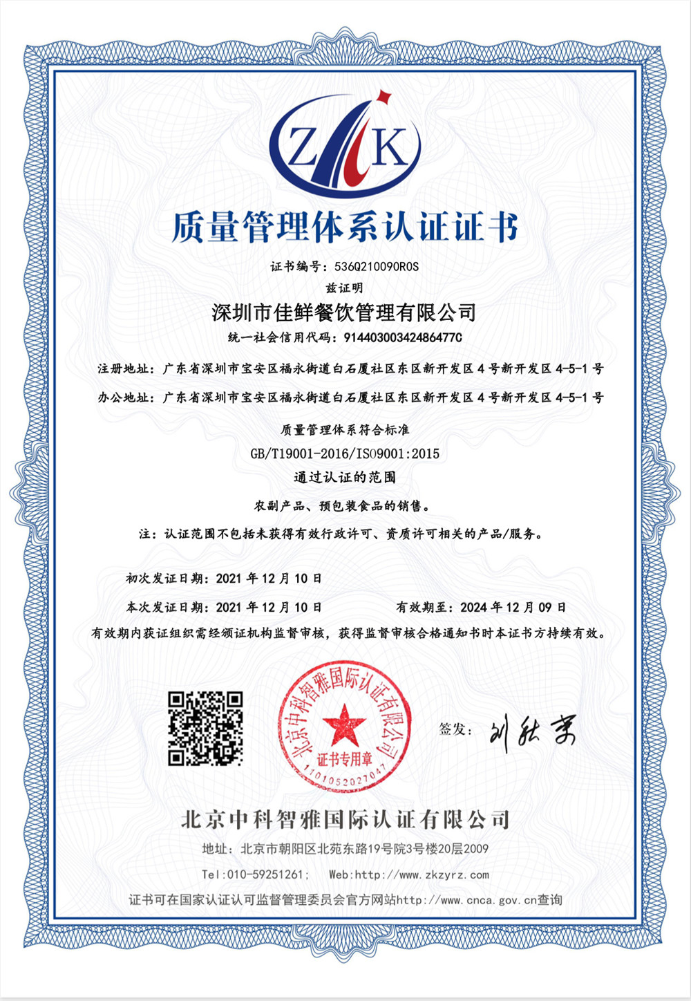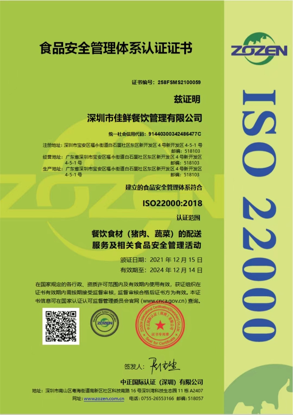 食品安全管理體系認(rèn)證證書